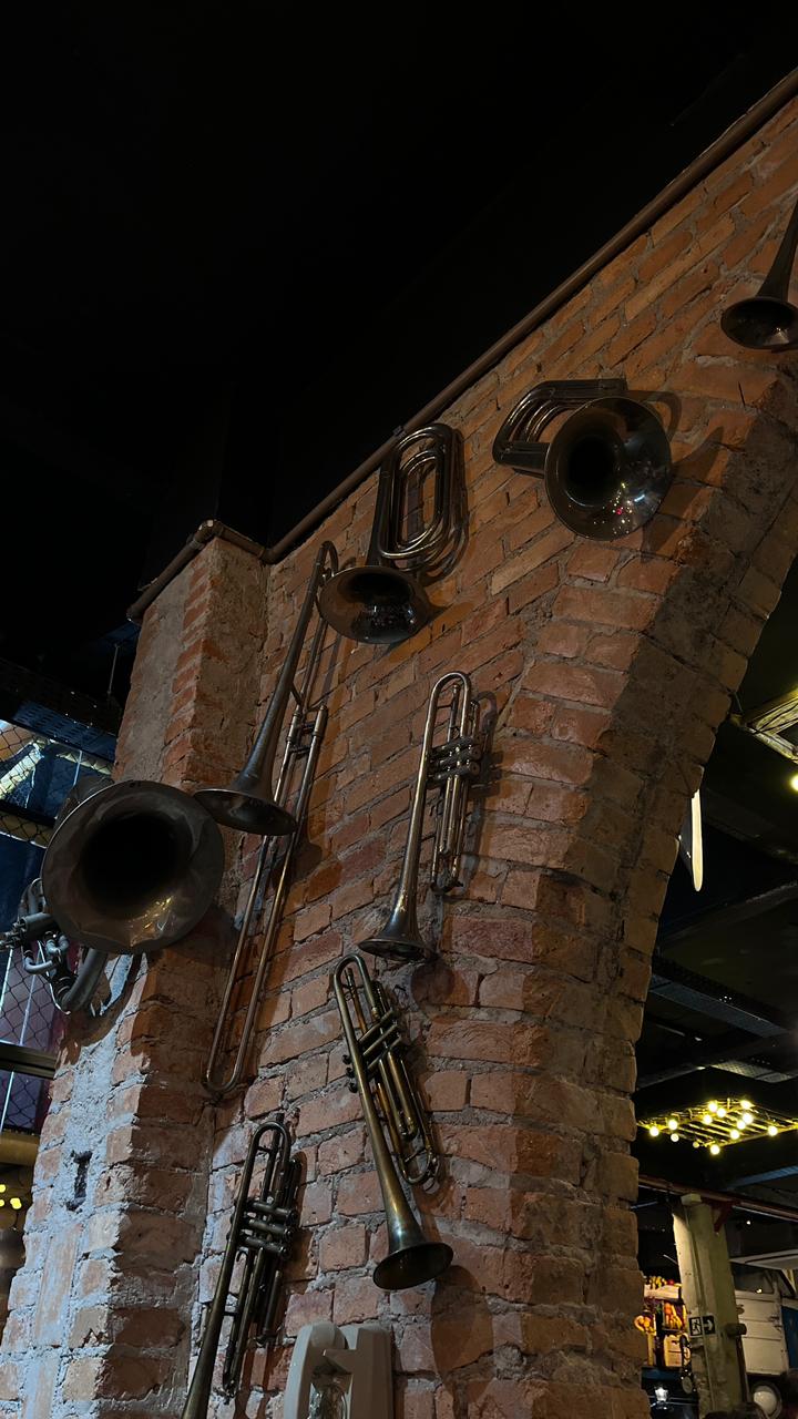 Instrumentos musicais decorando as paredes de tijolos do Jazz Restô e Burguers. Foto: Lívia Figuerola/Agenzia