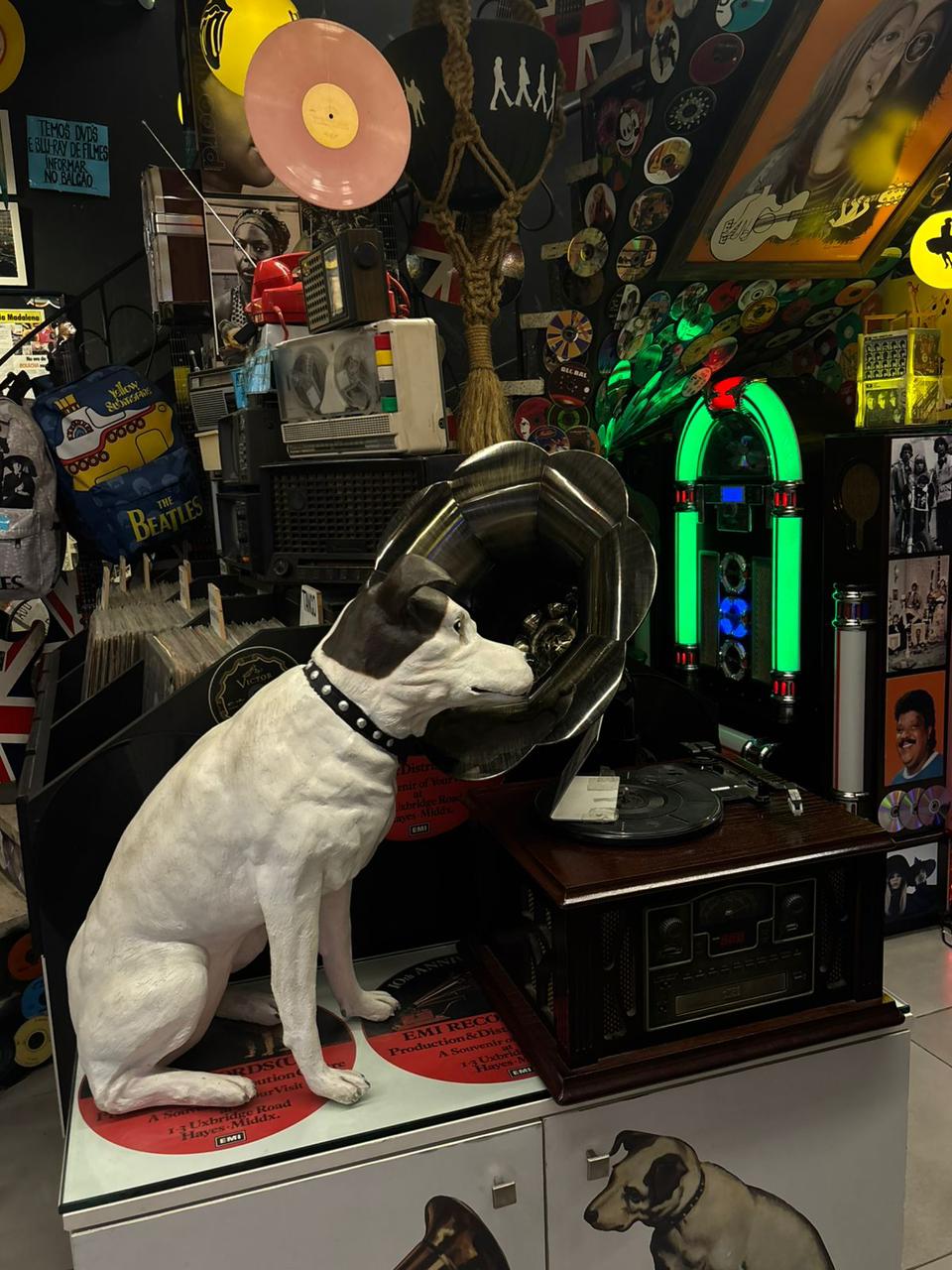 Estátua de cachorro escutando música na vitrola, em loja de disco localizada na região de Pinheiros. Foto: Mariah Malaguti/Agenzia